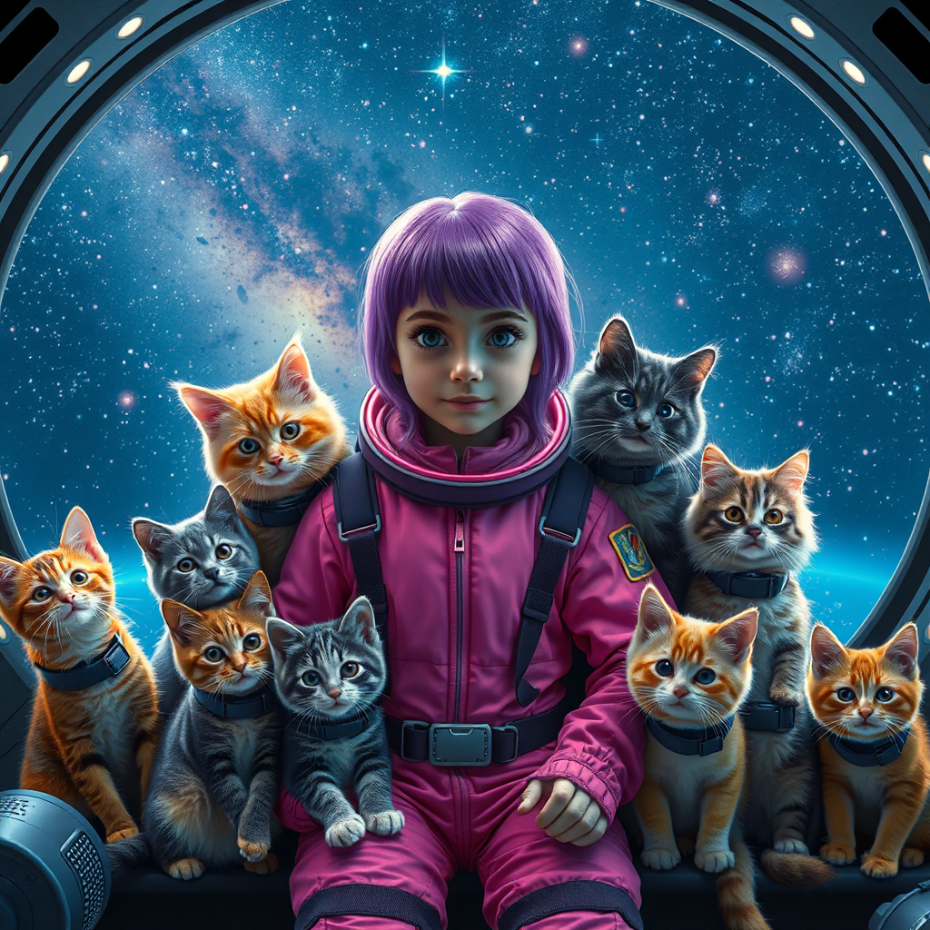 A mesmerizing girl with vibrant purple hair is surrounded by an eclectic mix of cats in various vibrant hues and sizes, all clad in adorable miniature astronaut suits, aboard a state-of-the-art space station. She's dressed in a charming pink and purple space suit that subtly shimmers under the soft, cinematic lighting. The backdrop reveals the breathtaking expanse of space, studded with countless twinkling stars and swirling galaxies, painting an awe-inspiring picture of the cosmos. The sleek design of the space station, adorned with intricate mechanical components, sets a futuristic tone. This whimsical and enchanting scene captures the essence of adventure and exploration as the girl and her feline companions embark on their cosmic journey together, rendered in ultra-high definition with a touch of Fuji color film magic.