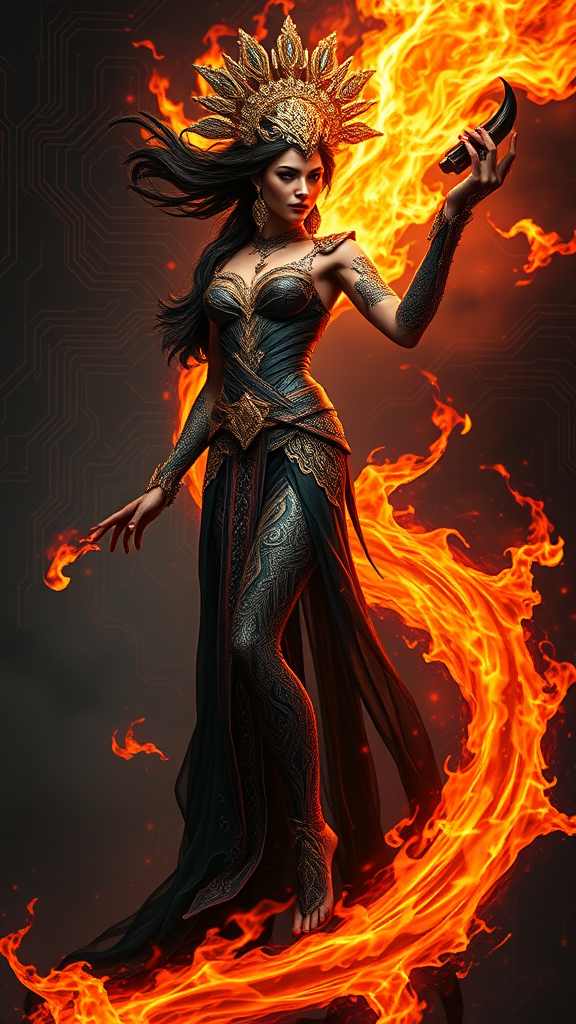 A mesmerizing hyper-maximalist depiction of a powerful young Queen of Flames in a tribal dark fantasy realm, standing regally on a swirling tongue of fire. Her full body is adorned in finely detailed, intricate clothing that hugs her form, highlighting a flawless and beautiful face. She strikes an elegant pose, embodying strength and grace, captured in perfect composition. Her presence is ethereal yet commanding, accented by a backdrop that resembles a circuit board in design, blending fantasy with elements of technology. The art is an ultra-realistic illustration in 8K resolution, embodying photorealistic concept art with intense shadows and dramatic lighting. The rendering gives a rich, almost tangible texture, sharpened to perfection, creating an image worthy of a high-definition wallpaper. This depiction is a stunning 3D octane render that pushes the boundaries of high-quality, high-definition art, vividly bringing the trial dark fantasy world to life, stylized at its highest potential.