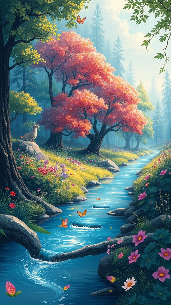 A mesmerizing illustration depicts a serene and tranquil landscape, where a vibrant and colorful forest serves as the backdrop. In the foreground, a gentle river flows gracefully, evoking a sense of peace and calm. The scene captures the enchanting style of a fairy tale, with magical elements subtly woven into the environment. Lush trees surrounded by an array of vivid flowers and soft, ethereal light filtering through the foliage add to the dreamlike atmosphere. Delicate creatures and whimsical details further enhance the fantastical charm of this idyllic setting.