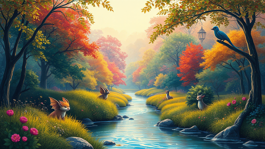 A mesmerizing illustration of a serene landscape exuding tranquility, showcasing a vividly colorful wooded background. In the foreground, a gentle river meanders, its shimmering waters reflecting the vibrant tapestry of surrounding flora. The scene is imbued with a whimsical fairy tale atmosphere, where the gentle rustle of leaves and the soft murmur of the river create a harmonious symphony that enchants the soul. Playful accents of mythical creatures peeking through the foliage add an unexpected touch of magic to this peaceful haven.