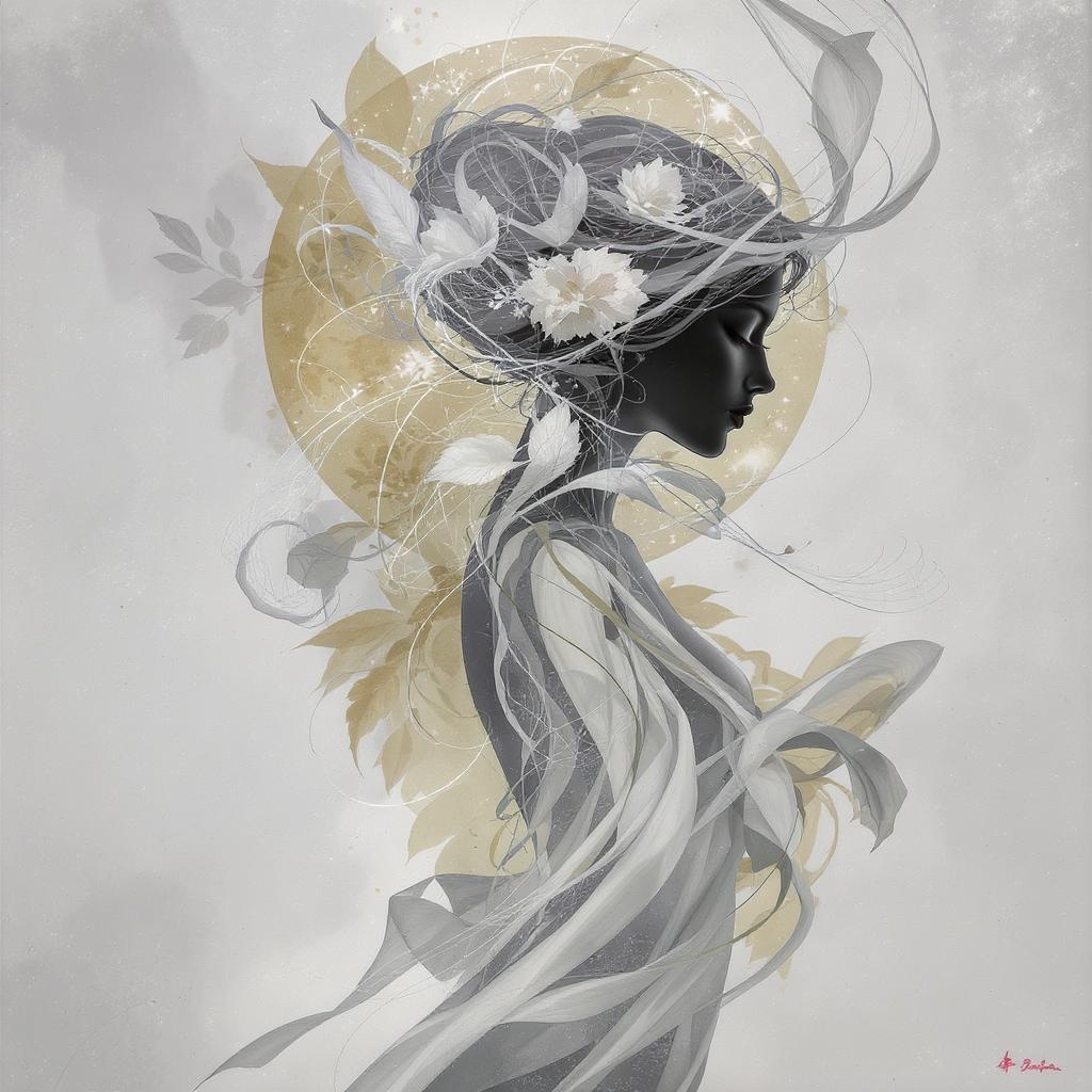 A mesmerizing illustration of a woman, capturing the essence of video montage aesthetics, intertwined with nature-inspired art nouveau. The artwork features soft-focus transitions, radiating an unbelievable beauty. Minimalist sketches highlight graceful curves with free, flowing brushwork, blending elegance and simplicity. Ratio 1:2, personalized touch with stylization level 750, version 6.1 influences subtly present.