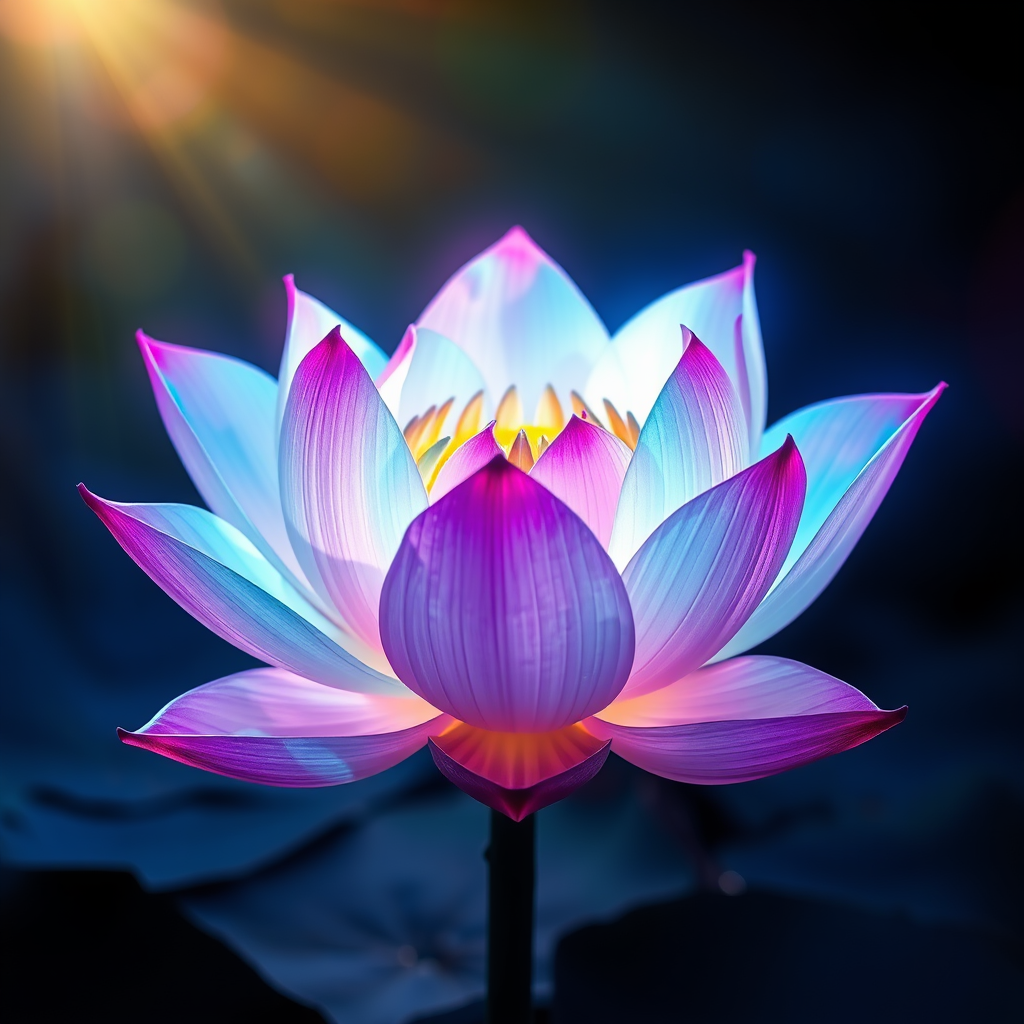A mesmerizing image capturing an award-winning lotus flower in full bloom, its petals shimmering with ethereal bioluminescence, exuding a vibrant spectrum of colors. Soft light gently embraces the scene, enhancing the delicate details and illuminating the elegant flower with a magical glow. The image, renowned on art platforms, exudes a serene beauty and tranquility, drawing viewers into its captivating allure, reminiscent of a dreamlike natural wonder.