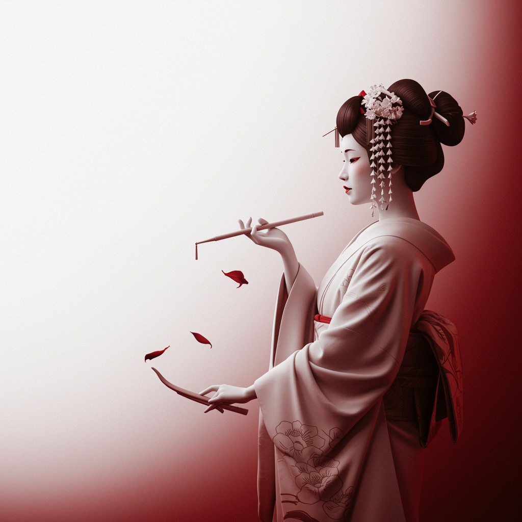A mesmerizing image of a Japan-inspired geisha, blending classical figurative realism with anime influences, set against a backdrop of light whites and deep crimson hues. The composition, reminiscent of Joel Robison's style, captures the elegance and grace of the geisha with a sculpted finesse that evokes the artistic nuances of 500–1000 CE. Utilizing the ultra-wide perspective of a Samyang AF 14mm f/2.8 lens, the artwork presents an elongated, dreamlike atmosphere with an ethereal quality. The scene should evoke a timeless beauty and tranquility, immersing the viewer in a delicate balance between tradition and art.
