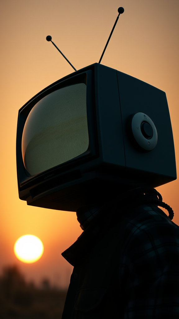 A mesmerizing image of a man with a vintage television set for a head, illuminated by dramatic lighting, against the backdrop of a pale sunrise. The scene is cinematic with a low-angle perspective, showcasing 4k hyper-realistic and focused details. The composition is reminiscent of a masterpiece, blending Studio Ghibli's enchanting artistry with the intricate complexity of John Constable's landscapes. The setting is designed with Unreal Engine 5's rich textures, offering an otherworldly and intricate atmosphere.