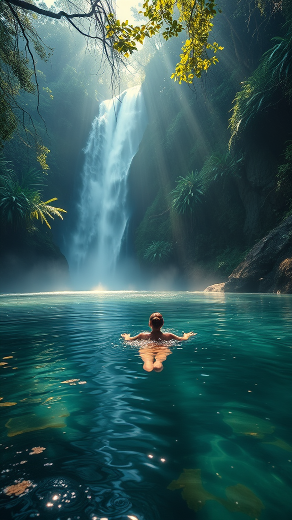 A mesmerizing image of a woman elegantly swimming in a serene lake by a majestic waterfall nestled within a lush jungle. The scene is enveloped in a delicate mist, enhancing the ethereal atmosphere with rays of volumetric lighting filtering through the canopy. Positioned at the center, the composition captures the essence of breathtaking beauty with intricate details and precise linework. The vibrant colors bring the scene to life, echoing the styles of Carne Griffiths and Conrad Roset, as dappled sunlight dances across the water. This visually stunning portrayal conveys a sense of tranquility and wonder, free from any distortions or artifacts, encapsulating the pure essence of nature's splendor.