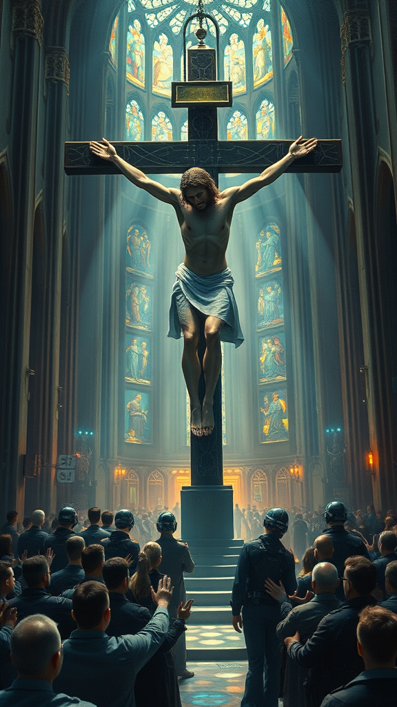 A mesmerizing impressionist oil painting depicts a cybernetic Christ, adorned with intricate, futuristic implants, hanging from a techno cross. This awe-inspiring figure is the focal point of a grand futuristic ceremony inside a vast techno cathedral. A devoted congregation of believers stands in fervent adoration, their hands raised in worship towards the cyber Christ. The scene is bathed in a dark, ambient light, dramatically enhanced by rays shining through towering stained glass windows, creating a volume and cinematic lighting effect. The painting captures a cyberpunk, sci-fi, neo-futuristic mood, reminiscent of Claude Monet’s impressionist style, embodying the idea of technology as humanity’s new faith. The ultra-wide composition and depth of field draw the viewer into this evocative portrayal where tradition meets the future.