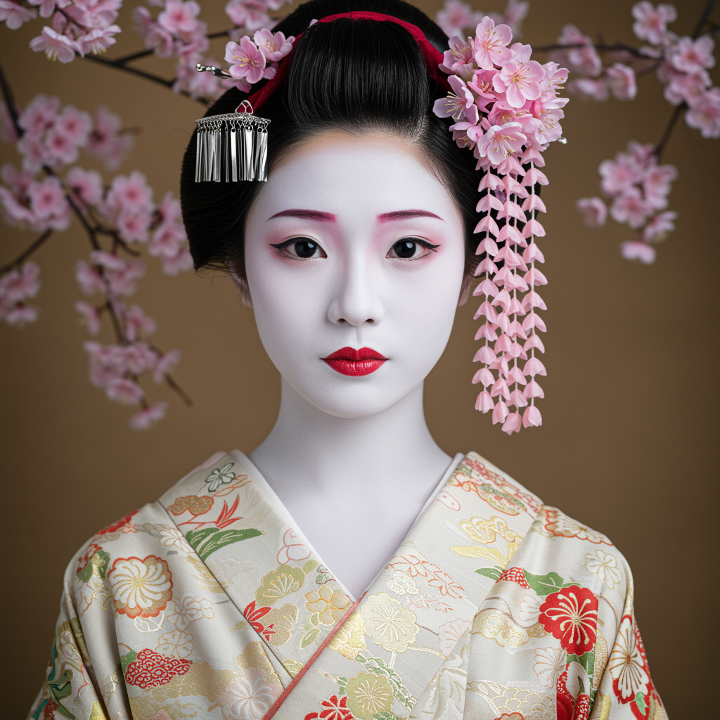 A mesmerizing Japanese woman with porcelain skin, her beauty is both flawless and radiant. Her ethereal presence is highlighted by dark, deep monolid eyes that hold a captivating gaze. The intricate eyeliner accentuates her allure, and her arched eyebrows express tender emotions. Her softly colored lips enhance her gentle and graceful appearance. She is adorned in exquisite silk kimonos, with ornate cherry blossom hairpieces that add depth to her enchanting visage. The scene embodies a serene and timeless elegance, drawing from traditional elements in a modern expression of beauty.