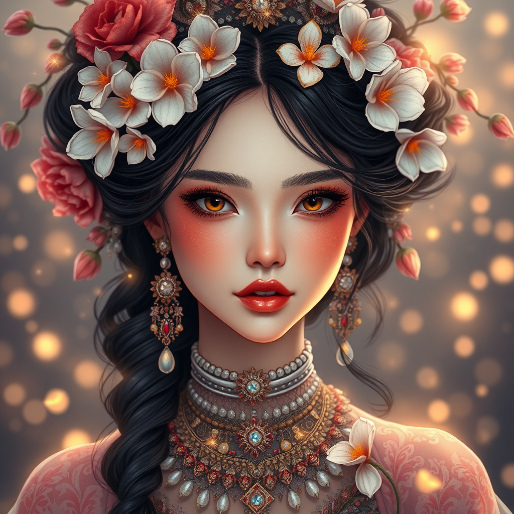 A mesmerizing Javanese-inspired fashion dream featuring a stunning girl adorned with exquisite jewelry and flowers, her hair sparkling like fireflies, exuding an ethereal charm. Designed in the style of renowned artists such as Artgerm, WLOP, and Ilya Kuvshinov, this digital artwork is a trending sensation on platforms like ArtStation. Influenced by the elegance of Chanel and Dior, with artistic touches from Daniel F Gerhartz, Akihiko Yoshida, Anna Dittmann, Tetsuya Nomura, and Tom Bagshaw, the piece is crafted with hyper-detail, sharp focus, and intricate features. Soft and warm lighting highlights her symmetrical facial features and accurate anatomy. The vibrant, colorful ink illustration is enhanced by subtle bokeh effects, rendered in stunning UHD, HDR10 quality, showcasing an ultra high-resolution 16K masterpiece. Despite its complex details, the artwork avoids any duplication, distortion, or aberrations, presenting a flawless representation without any low-resolution artifacts, ensuring a captivating visual experience.