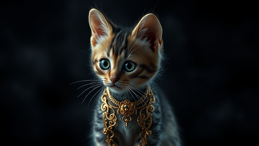 A mesmerizing kitten, intricately crafted as a gold clockwork feline adorned with delicate golden filigree, set against a mysterious abstract dark background. Captured with the dramatic interplay of light and shadow, showcasing chiaroscuro effects. Emphasizing high detail and hyper realism, the scene is imbued with a sense of acceleration. Photographed in stunning 8K resolution, offering cinematic depth and clarity, with long exposure adding a dynamic, almost magical quality. The image is perfectly balanced in a 1:1 aspect ratio, highlighting the kitten's exquisite craftsmanship and elegance.