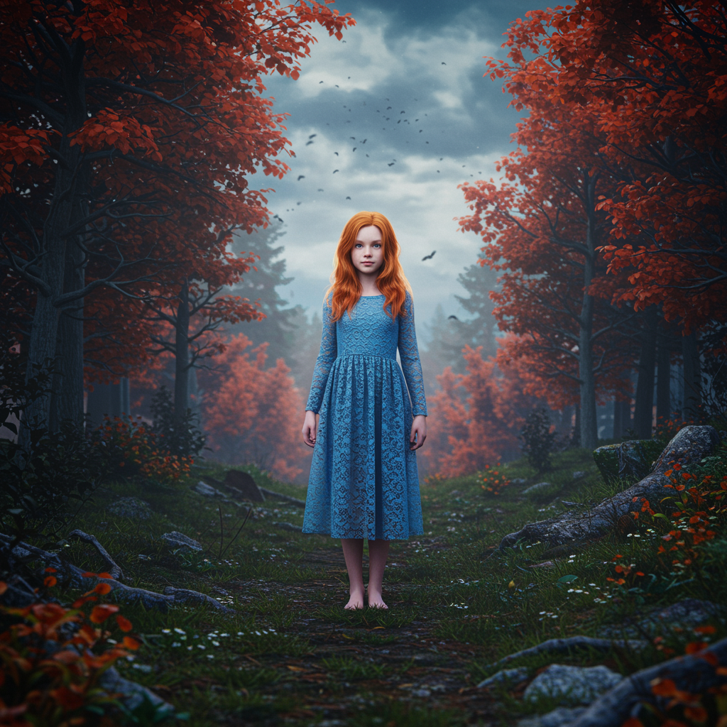 A mesmerizing landscape blending a vibrant fantasy forest and the haunting tones of Dante's Inferno. In the heart of the scene stands an enchanting full-body portrait of an exquisite Nordic red-haired girl, her innocent smile and delicate feet accentuating her charm. She wears a flowing blue lace dress, atop a lush hill, surrounded by the mystical forest. Her symmetrical hazel eyes, with their detailed circular irises, convey an emotion that's both realistic and captivating. This stunning scene captures a hyperrealistic, cinematic moment resembling a photograph, yet with the intricate artistry of a 3D render. The atmosphere merges a dark and gritty elegance reminiscent of Mucha, Klimt, and Erte. A dramatically detailed masterpiece that echoes the styles of artists Artgerm, H.R. Giger, and Beksinski, trending on ArtStation. Vibrant UHD and HDR colors converge in ultra-high definition, crafting a visually astonishing 8k render. This captivating piece of art, showcased in an epic and ominous light, is an emblem of fantasy and surrealism, evoking the creativity of Tanvir Tamim. A work of intricate beauty and vivid detail, worthy of a Behance contest winner and featured prominently as a portrait on Unsplash, it presents an otherworldly yet profoundly human allure.