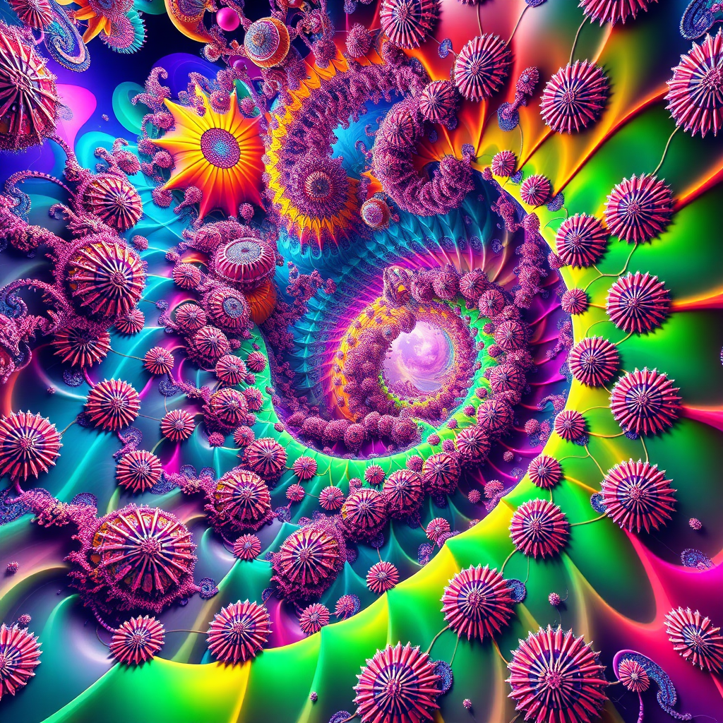 A mesmerizing landscape of intricate fractals, bursting with vivid and complementary colors, showcasing the elegance of the golden ratio. The scene pulsates with a DMT-inspired kaleidoscope, featuring sharp, detailed lines and a crystal-clear focus, rendered in stunning 8k resolution. Rainbow hues shift seamlessly, paying homage to the surreal and mythical visions of Bruno Degazio and Peter Mohrbacher. The artwork captures the essence of Gustave Dore's grandeur and Alphonse Mucha's graceful curves, blending into a dream-like tapestry reminiscent of DeviantArt's imaginative mutations, with elements that challenge the boundaries of the human form. An otherworldly vision without any visible watermarks or signatures.