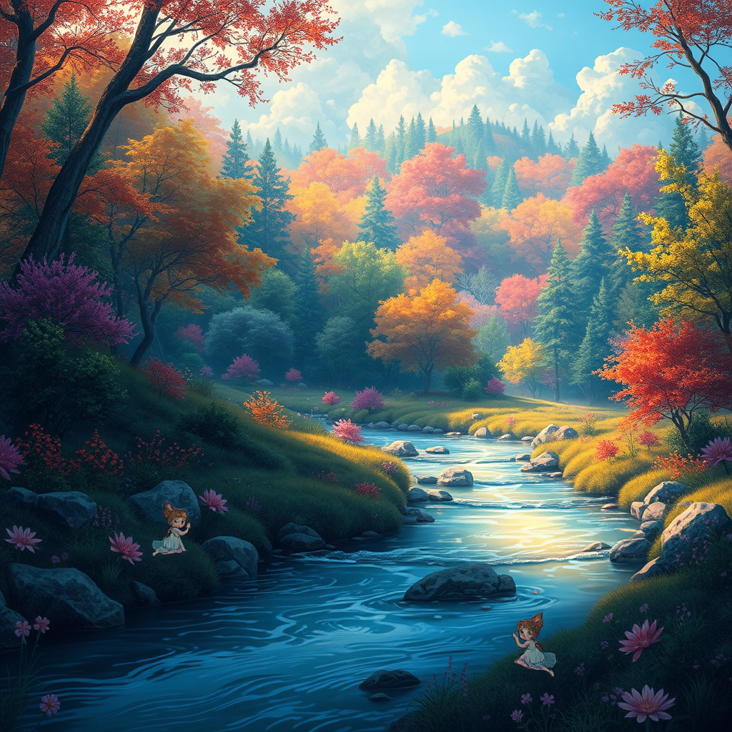 A mesmerizing landscape that exudes tranquility and serenity, with a vibrant woodland background awash in an array of colors. In the foreground, a gently flowing river glimmers under the soft light, while whimsical, fairy-tale elements add a touch of magic to the scene.