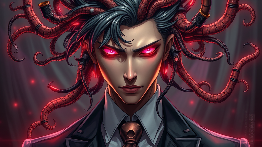 A mesmerizing male anime character exuding a presence of commanding mystique, adorned with organic tendrils reminiscent of Giygas, embodies the essence of a forest druid melded seamlessly with the sleek elegance of a business suit. This ultra-realistic illustration captures a retro-futuristic male cyborg punk aesthetic, combining intricate and highly detailed features, including technological rings and sharp deviations. Crafted in the style of James McCarthy, Beeple, and Johfra Bosschart, the artwork finds harmony with Ayami Kojima's influence, delivering a masterpiece that blends hyper-realism with fantastical elements. Rendered in vibrant Beeple-style 3D render using Unreal Engine, the piece showcases an intricate Nouveau filigree scrollwork, bringing forth an artwork that captivates and immerses. Taking inspiration from artists like Tooth Wu, WLOP, and Dan Mumford, the concept art thrives on octane render technology, highly trending on platforms like ArtStation. The assembly of symmetrical and coherent composition by Greg Rutkowski reveals cinematic elements and key art features, captured in stunning 8K resolution. Iridescent accents play throughout, invoking a mystical vibe reminiscent of Albedo from Overlord and the enchanting allure of the library of gems, delivering an exquisite tapestry of intricate abstract artistry.