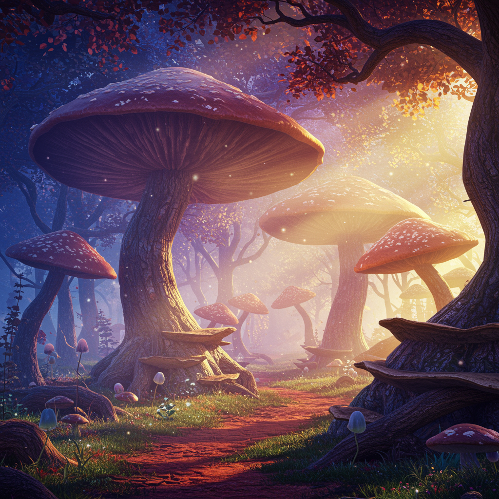A mesmerizing masterpiece, depicting an enchanted forest imbued with dreamlike qualities, where ethereal light dances across a spectrum of vibrant colors. The scene is alive with intricate mushroom-shaped trees, bathed in a soft, mystical glow. The artwork, reminiscent of Van Gogh's style, boasts intricate detailing and an ultra-realistic touch, akin to the capabilities of Unreal Engine 5. Presented in stunning UHD, HDR quality, the scene captures the essence of a fantastical realm. Full of color and wonder, this dreamscape invites viewers into a realm of pure imagination, untouched by the mundane confines of reality.