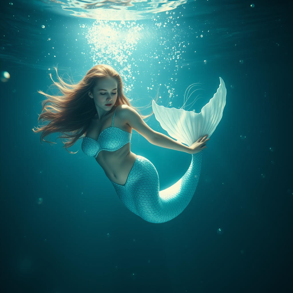 A mesmerizing mermaid gracefully glides through the ocean's depths, surrounded by shimmering air bubbles that dance like tiny jewels. Her flowing hair and elegant tail reflect the soft hues of light blue, as ambient light filters through the water, casting ethereal patterns on her skin. The scene captures a photorealistic quality, with each shimmer and ripple vividly depicted in 8K detail. The atmosphere is illuminated by a gentle floodlight, highlighting the mermaid's serene expression and the intricate textures of her scales. The cinematic lighting adds a dramatic contrast, enhancing the sense of wonder in this underwater world, evoking beauty and tranquility in equal measure.