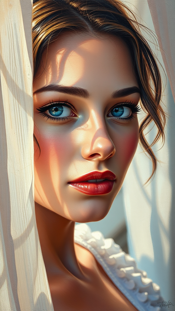 A mesmerizing painting of a woman gazing through a sunlit window, her delicate features captured with playfully intricate details and a rich, heavy impasto technique, exuding an unbelievable beauty. The scene is infused with romantic flair, as the close-up perspective draws you into her contemplative world, surrounded by soft, dreamlike colors. Her expression is serene yet captivating, embodying the allure and elegance of classic femininity, set against a backdrop that enhances the enchanting aura of the moment.