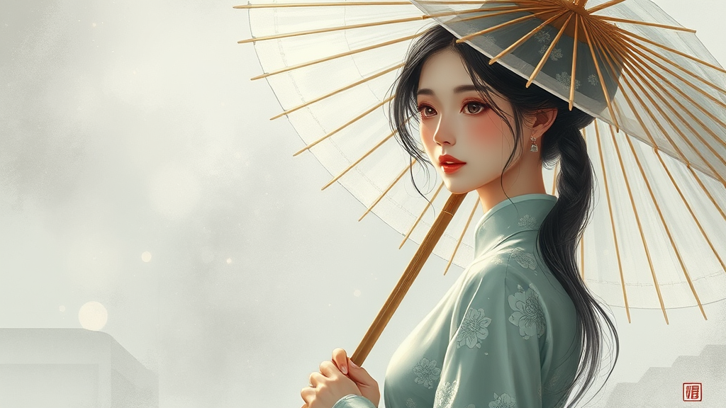 A mesmerizing painting of a woman in traditional Chinese attire holding a delicate bamboo umbrella, rendered in an enchanting romantic manga style. The ethereal transparency of the scene is accentuated by soft shades of dark white and light gray, with subtle hints of dark white and light green adding to the allure. The artwork captures an incredible beauty, exuding romantic illustrations seasoned with refined feminine sensibilities.