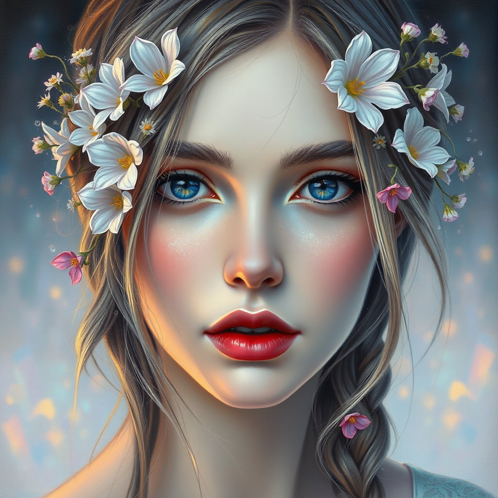 A mesmerizing painting of a woman with delicate flowers woven into her hair, echoing the styles of James Jean and WLOP, exuding a hauntingly beautiful aura. The fantasy portrait art captures the ethereal essence of Ophelia, blending realistic fantasy elements with the intricate detail akin to Loish and Anna Dittmann. The scene unfolds in an iridescent spectrum, embodying imaginative realism. The woman's gaze is both captivating and mysterious, her expression reflecting a serene, otherworldly grace. Each brushstroke conveys the intricate beauty of an oil painting, bringing to life a fantastical portrait that resonates with the viewer's imagination.