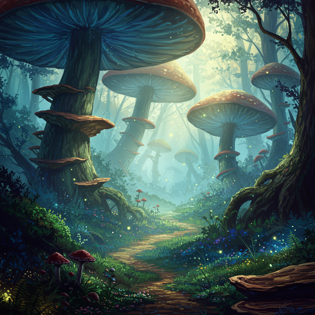A mesmerizing painting of an enchanted forest imbued with ethereal light, bursting with vibrant colors; towering mushroom trees loom over the scene under a soft, mystical glow. Every detail intricately rendered, as if crafted in an ultra-realistic, dreamlike world. The ambient light is subtle yet illuminates the vivid hues, reminiscent of Unreal Engine 5’s stunning graphics. A masterpiece that evokes the imaginative spirit of Vincent Van Gogh, captured in stunning HDR, as if painted in an astonishing 12k resolution, bringing this fantastical landscape to life with small, magical touches that transport the viewer to another realm.