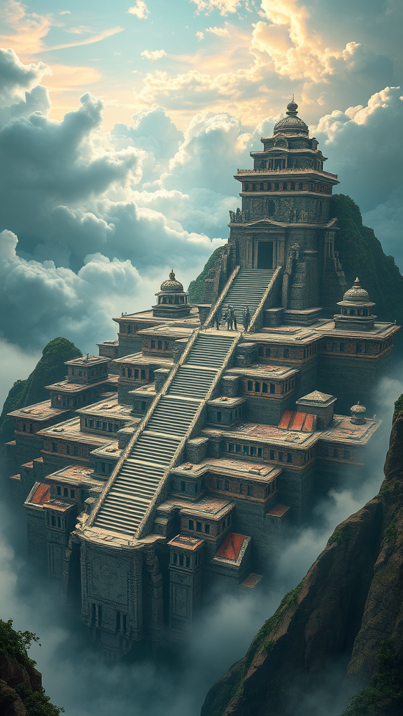 A mesmerizing Phase-Space Astral Inca city, suspended amidst ethereal clouds, rendered in stunning photorealism using an octane engine, 8k resolution. This ancient city tells a tale of mystery and wonder, its intricate architecture adorned with designs that defy reality, enhanced by a vividly detailed matte painting. The scene is alive with deep, rich colors playing in perfect harmony with complementary tones, illustrating a world where fantasy knows no bounds. Concept art captures the essence of a forgotten world, inviting one to dream with eyes wide open in this captivating 8k fantasy landscape.
