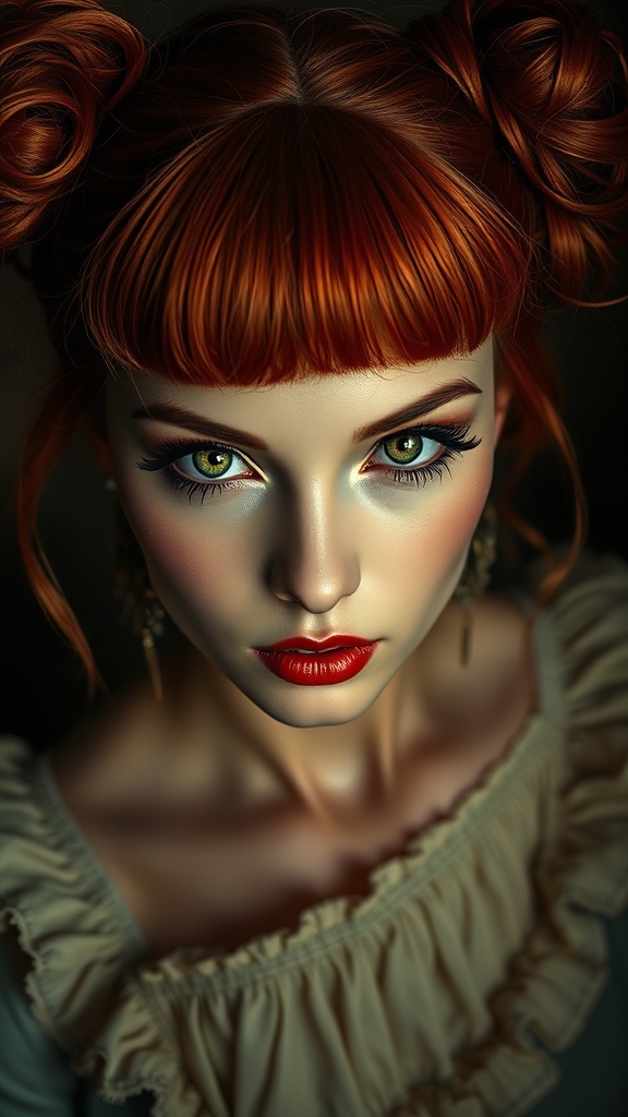 A mesmerizing photograph captures a highly detailed woman with striking piercing green eyes and an intricately detailed face. Her luminous red hair is styled in a double bun with stylish bangs, complementing her detailed clothing adorned with frills. Her skin glistens with a shiny glossy finish, demonstrating exceptional subsurface scattering. The setting is dramatic, with deep shadows and a dark atmosphere, contrasted by the vibrant, award-winning colors reminiscent of film stock and rich lifelike textures. The scene, inspired by Lee Jeffries, is captured through a Nikon D850 with a f1.6 lens, providing extraordinary fine detail and a hyper-realistic appearance. This art, trending on ArtStation, boasts cinematic lighting and an Unreal Engine quality, echoing the finesse of Kodak Portra 400 and Cinestill 800 tungsten film. The photograph, rooted in Style-Neeko, presents an ethereal yet lifelike depiction, resonating with dramatic beauty and fine artistry.