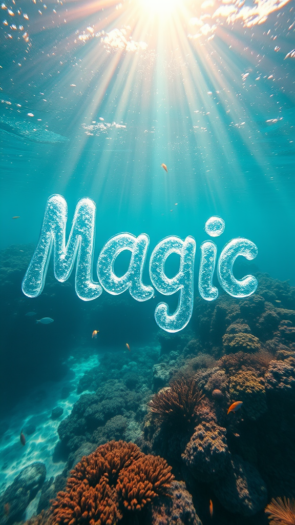 A mesmerizing photograph captures the word "Magic" crafted from ethereal water bubbles, gracefully forming letters that shimmer and dance in the crystal-clear depths of the ocean. These delicate bubbles slowly dissipate, adding a touch of transience to the enchanted scene. The underwater backdrop features a stunning variety of marine life, with vibrant coral gardens and colorful fish creating a dynamic tapestry. Sunlight filters through the waves, casting beams of light that illuminate the scene, enhancing its mystical and awe-inspiring atmosphere. The image evokes a sense of wonder and enchantment, inviting viewers into an otherworldly aquatic realm.