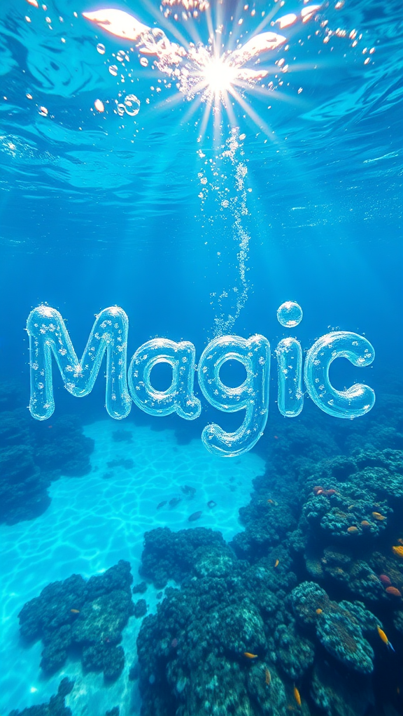 A mesmerizing photograph captures the word "Magic" enchantingly formed by water bubbles, their delicate, shimmering forms crafting each letter with elegance before gracefully dissolving into the crystal-clear blue water. The tranquil underwater setting is alive with a colorful tapestry of marine life, creating a vivid and dynamic backdrop. Sunlight pierces through the water's surface, casting a radiant glow that enhances the mystical ambiance. This image evokes a profound sense of wonder and enchantment, inviting the viewer to immerse themselves in a world of underwater magic.