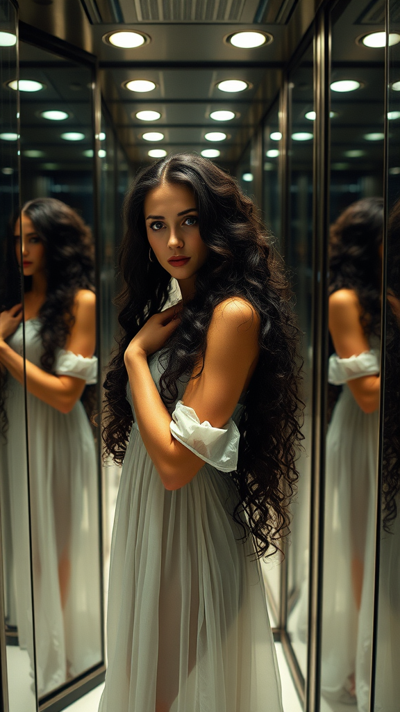 A mesmerizing photograph of the elegant Jessica Chastain, radiating both grace and powerful resolve, as she poses in an elevator surrounded by four full-length mirrors. Her luxurious long black curly hair enhances her striking appearance. She wears a delicate white semi-transparent nightgown. The mirrors magnify her charm, creating an enchanting and dynamic atmosphere, cinematic, vivid, and full of life.