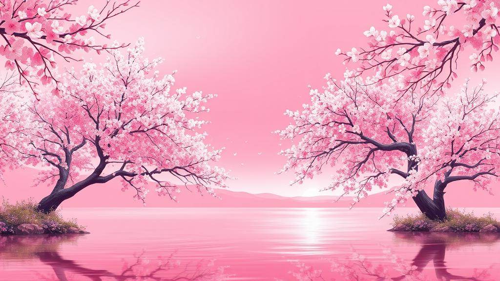 a mesmerizing pink landscape with perfect pink shading and atmospheric lighting, inspired by the styles of makoto shinkai, stanley artgerm lau, wlop, and ross draws; a serene scene where everything is enveloped in varying shades of pink, from pastel to deep rose, creating a dreamlike ambiance. delicate cherry blossoms float in the air, their petals softly illuminated by the radiant pink glow. a gentle breeze stirs the leaves of the trees, casting intricate shadow patterns on the ground. the sky is a vast expanse of soft pink hues, blending seamlessly into a horizon that seems to stretch into infinity. tranquil waters mirror the pink sky, their surfaces disrupted only by the occasional ripple. the overall atmosphere is ethereal and calm, a reflection of an ideal pink paradise.