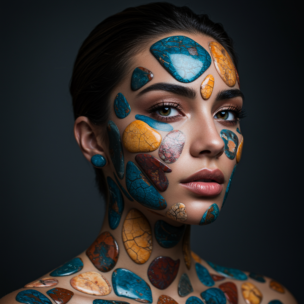 A mesmerizing portrait focuses on a stunning woman’s face subtly overlaid with an array of stones, each uniquely shaped and patterned. The stones display a vibrant palette of deep blues, fiery reds, warm oranges, and soft grays, creating a vivid contrast against her features. Each stone's surface varies in texture, with some appearing rugged and cracked, while others possess a sleek, polished finish, adding depth and intrigue. This fusion of natural patterns and striking colors crafts an enchanting and intricate visual tapestry, blending the organic beauty of geology with human allure.