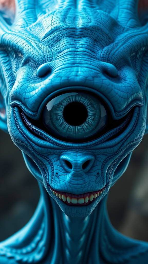 A mesmerizing portrait of a blue alien with an enormous single eye and large ears, featuring a whirlwind of vibrant colors. The character is centered in the frame and exhibits a symmetrically detailed face with textured skin. Captured in a hyper-realistic style, the composition embraces epic sci-fi and fantasy elements, enhanced by cinematic lighting that adds depth and drama. This digital painting shines with sharp focus and detail, rendered in 8k resolution to ensure every nuance stands out. The masterpiece embodies digital art at its finest, offering a glimpse into an alien world that balances creativity and ultra-realism within a vertical 9:16 aspect ratio, blending genre influences into a harmonious visual statement.