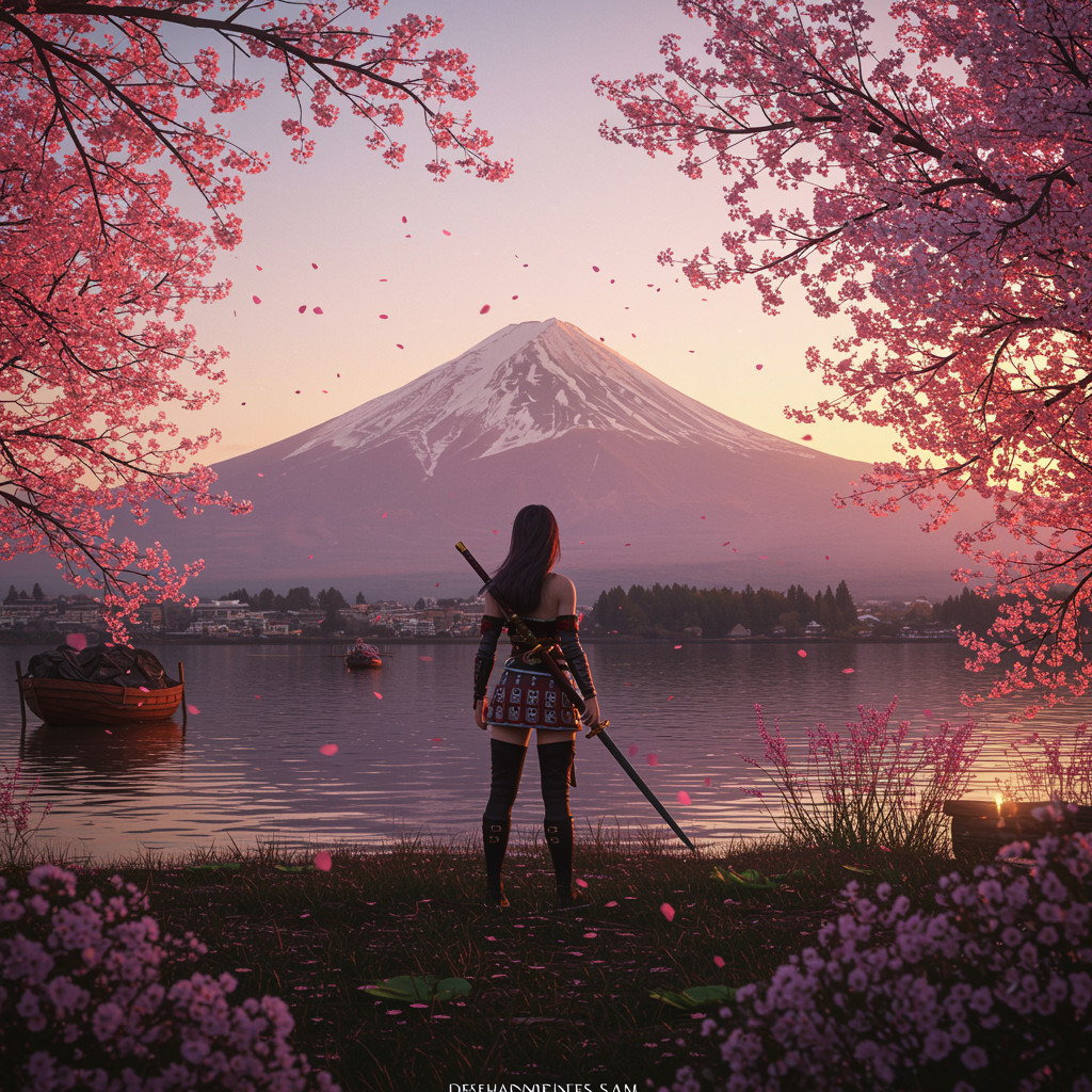 A mesmerizing portrait of a female warrior poised gracefully by a serene lake surrounded by blossoming cherry trees, with the majestic silhouette of Mount Fuji standing tall in the background. The scene captures the essence of spring, bathed in the warm hues of a setting sun. The composition is perfectly centered, showcasing intricate, highly detailed artistry that radiates breathtaking beauty. The digital art is vibrant and layered with comprehensive cinematic elements, with the influence of Anna Dittmann evident in the use of delicate volumetric lighting. The image is marked with a subtle text watermark, and the artist's name, highlighting its originality and creative ownership.