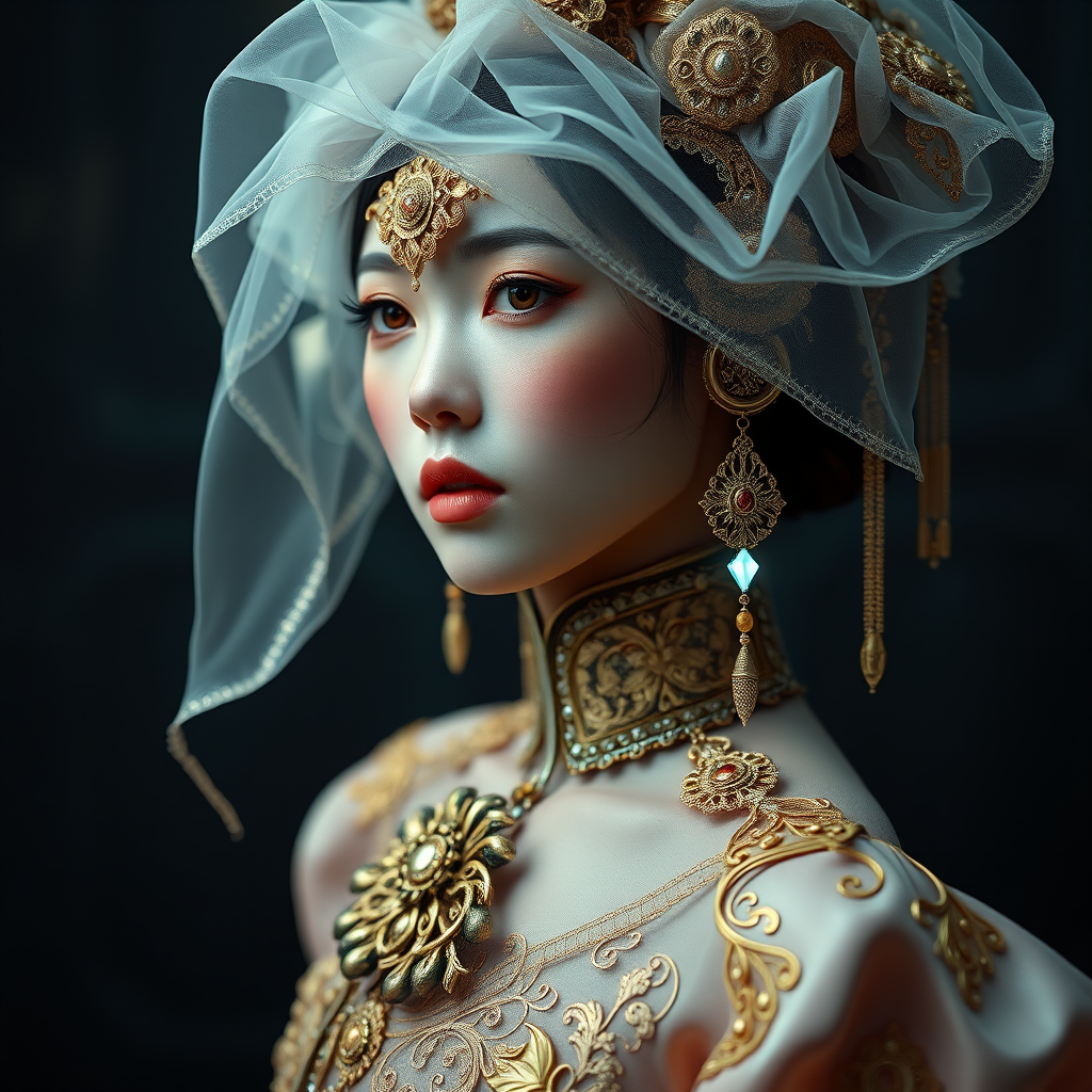 A mesmerizing portrait of a girl beautifully transformed into a sleek cyborg, adorned in an opulent and intricate high fashion fantasy outfit. Her ensemble blends elements of Victorian and Chinese aesthetics, featuring delicate veils and a Victorian dress constructed with Chinese patterns. Drawing inspiration from the siren form in Jibaro on Netflix, her garb is rich with couture ornamentation, exhibiting gold filigree and dynamic details. The color palette is sumptuous and vibrant, with each hue meticulously chosen. Set against the backdrop reminiscent of Harper's Bazaar, the piece achieves an elegant and centered composition akin to creations found on ArtStation. The imagery is captured with a smooth, sharp focus through an octane render, revealing reflect and caustic effects enhanced by a subtle white neon glow. The portrait mirrors the essence of Autochrome Pearl Portraits and Pearl Silverplate aesthetics, enriched with Golden Jewelry and Silverplate intricacy. It is hyperdetailed, realizing the artistry of Kim Jung Gi, Soey Milk, WLOP, Artgerm, Greg Rutkowski, and Alphonse Mucha. The advanced rendering using Unreal Engine 5 is highlighted by global illumination and radiant light, crafting an ultrafine fantasy masterpiece.