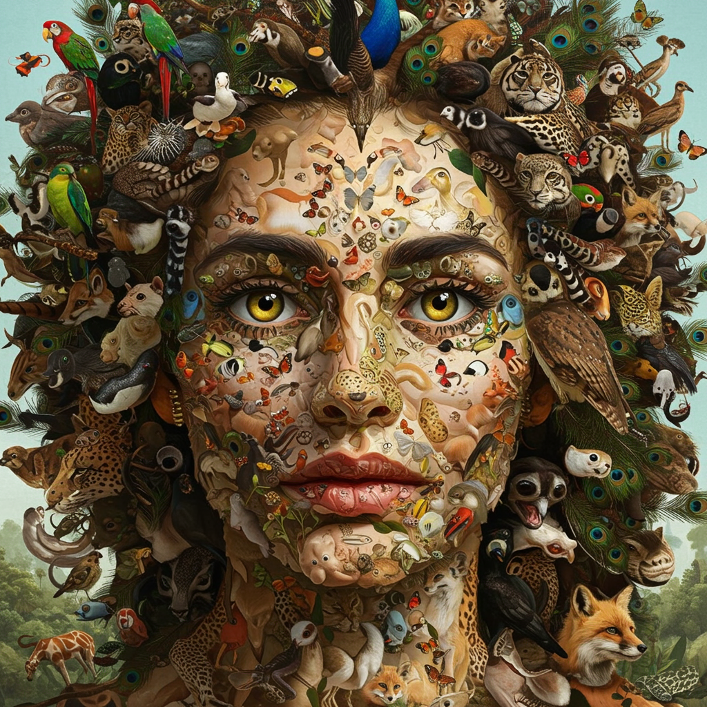 A mesmerizing portrait of a person with an expression of serene wisdom, intricately crafted using a vibrant multitude of animals, each species artistically positioned to form the facial features, skin tones, and flowing hair. Tiny, colorful parrots mimic the arch of eyebrows, while sleek, glistening fish create the illusion of smooth skin. Delicate butterflies gather to form the gentle curve of the lips, and the eyes are brilliantly represented by the striking pattern of owl's eyes. A mane of diverse creatures, including the flowing feathers of peacocks and the silky fur of foxes, cascades around the face, blending seamlessly to recreate lifelike hair in a tapestry of textures and hues. The whole image breathes with the vivacity of the wilderness, a homage to nature, reminiscent of Arcimboldo’s style but uniquely reimagined through a spectrum of biodiversity.