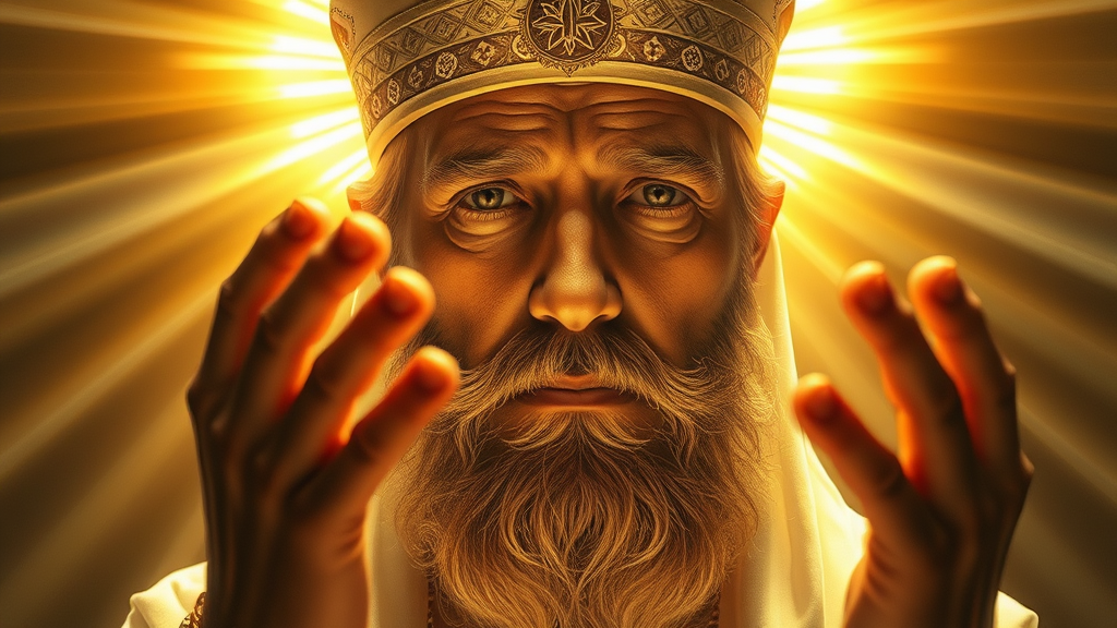 A mesmerizing portrait of a sacred priest enveloped in holy light, capturing ultra-quality visuals with intricate details and perfect anatomy. The ambiance is magical and divine, highlighting a beautifully rendered face with golden hues. The composition features a 3D effect, emphasizing a stunning, sacred presence. Enhancing the uniqueness are slight artistic deviations, with subtle distortions creating an otherworldly charm. The intriguing offbeat details, like extra fingers and a sense of mutation, whisper of an ethereal realm. The piece is a fascinating blend of perfection and oddity, evoking a sense of both reverence and curiosity, keeping the viewer entranced by its beauty and mystery.