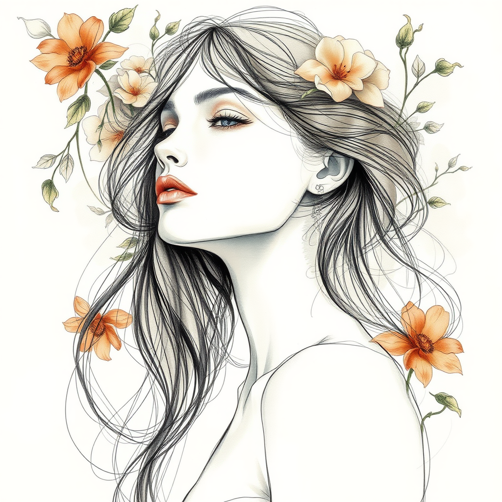 A mesmerizing portrait of a woman blending into an art nouveau style, her essence captured through nature-inspired curves and soft-focus elements. Her form is a minimalist sketch, gracefully detailed with free-flowing brushwork that evokes a sense of beauty almost beyond belief. The composition is elongated in a 1:2 aspect ratio, emphasizing her elegance, while subtle stylistic flourishes highlight her serene and timeless allure.