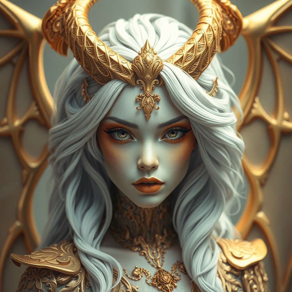 A mesmerizing portrait of a woman in exquisite demon attire, featuring an intricate blend of light gray and light gold hues. The vibrant illustration is intricately sculpted, showcasing hyper-detailed realism. Her visage is an exquisite balance of white and amber tones, emanating an aura of regal elegance. The setting conveys an ethereal sense of queencore, depicting a scene that borders between fantasy and reality in an elongated 3:5 aspect ratio.