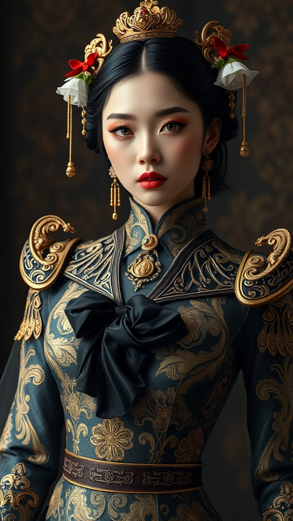 A mesmerizing portrait of a young woman, a stunning beauty cyborg wearing an extravagantly ornate high fashion fantasy ensemble, a fusion of Victorian and Chinese influences. The suit is adorned with intricate couture ornamentation, gold filigree, and dynamic, rich colors akin to a piece showcased in Harper's Bazaar. The dress features Victorian designs intricately patterned with Chinese motifs, flowing veils, and an alluring siren-like form reminiscent of Jibaro from Netflix intertwined with modern couture aesthetics. Her elegance is captured in a centered composition with graceful style, rendered with the precision of an artstation octane render. Delicate reflections, caustics, and a soft white neon glow illuminate her features, echoing an Autochrome Pearl Portrait with a hint of Pearl Silverplate, complemented by golden jewelry and silver accents. The intricate details, hyper-detailed craftsmanship, and ultrafine elements seem almost unreal, blending the inspiration of masters like Kim Jung Gi, Soey Milk, WLOP, Artgerm, Greg Rutkowski, and Alphonse Mucha with the advanced capabilities of Unreal Engine 5, bathing the scene in a radiant, globally illuminated fantasy light.