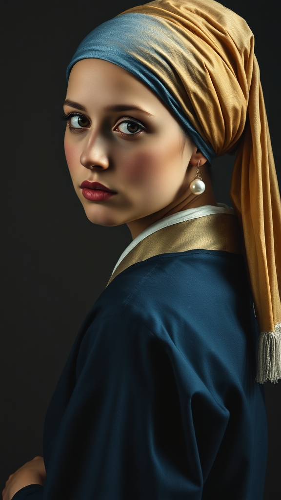 A mesmerizing portrait of a young woman adorned with a radiant pearl earring, capturing the essence of the Dutch Golden Age. She gazes softly over her shoulder, her delicate features highlighted by subtle chiaroscuro. Her attire, a deep indigo robe contrasted with a soft golden turban, creates a harmonious blend of color and light. The background, a muted darkness, enhances her ethereal presence. The use of intricate brushwork and a gentle stylization brings a modern touch to this timeless masterpiece, maintaining its core elegance and allure.