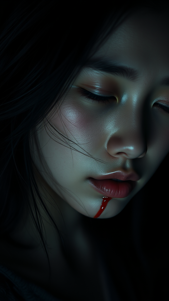 A mesmerizing portrait of an Asian woman, etched with the sorrow of profound loss, her expression capturing the depth of her anguish. A delicate trickle of blood marks her chin, symbolizing the pain she carries. The scene is enveloped in a somber atmosphere, dark shadows casting an eerie backdrop to her youthful despair as she grapples with the solitude ahead. Subdued hues and dim lighting enhance the melancholic mood, while intricate textures highlight the raw emotion etched onto her face. The composition is a breathtaking 4K visual, where every detail, from the gentle curve of her lips to the blurred teardrops on her cheeks, tells a story of resilience amidst despair.