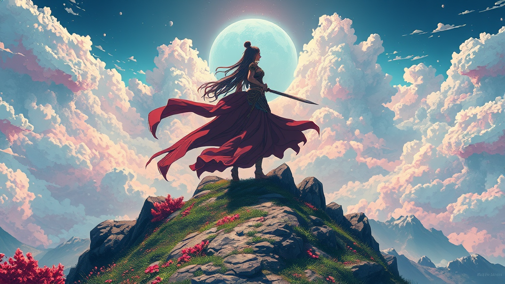 A mesmerizing poster of a warrior goddess stands proudly atop a hillside, perfectly centered in the composition. Rendered in an anime style, this key visual bursts with intricate and highly detailed artistry. It captures a breathtaking and vibrant panorama, exuding a cinematic quality. Inspired by the stunning works of Carne Griffiths, Conrad Roset, and Makoto Shinkai, the visual combines elements of fluid motion and colorful dynamism, inviting viewers into a world of majesty and wonder.