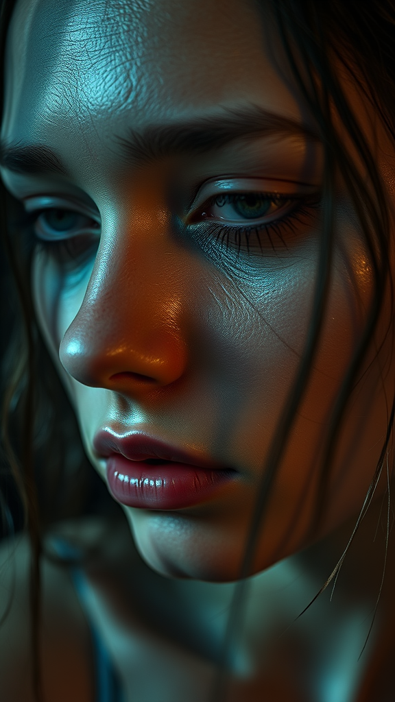 A mesmerizing, reinvented despair, twisted to perfection, model nixie, 8K cinematic, hyperrealistic, unsettling tranquility, foreground blending, photorealistic CGI emulations, incredibly realistic texturing, sublime seductive, implied shadows, mild nSFW nipples, fine-grained high detail skin pores, glue-like skin reflectivity, alluring imperfections, glinting lenses, drama-infused lighting, artistic distortion, rough and refined at once, observed details in state-of-the-art photorealism, elaborate atmospheric shadow effects, intriguing mystery obscuring part of the subject's mesmerizing face, unadulterated drama at any angle, exemplary neat geometrical proportions.
