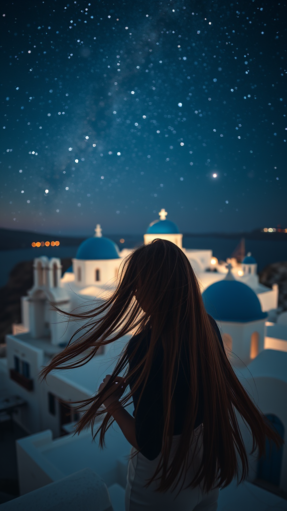 A mesmerizing scene featuring a woman with flowing long hair, captured in hyper detail with a stunning depth of field, stands against the enchanting backdrop of Santorini. The night sky sparkles with a myriad of stars, casting a magical glow over the iconic white buildings and azure domes. Her elegant silhouette is highlighted under the 16k resolution, bringing out vivid textures and contrasts. The panoramic view, in aspect ratio 16:9, enhances the captivating beauty of the Santorini landscape under a starry, endless night.