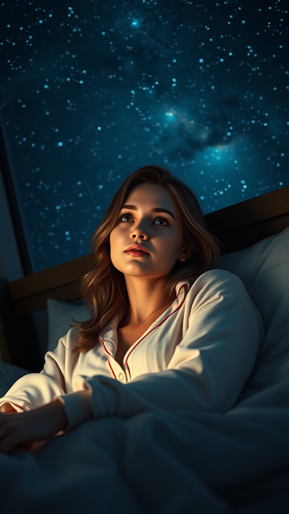 A mesmerizing scene featuring a young woman in a peaceful, detailed bedroom setting against a starry night sky. Her full body is portrayed gracefully, lounging in soft pyjamas with carefully rendered details of her face, highlighting exquisite eyes and full, delicate lips. The cinematic lighting enhances her serene expression, casting gentle shadows. The high-quality rendering captures every nuance, emphasizing the interplay of light on her skin and surroundings. An air of tranquility fills the room as she gazes out, beyond the viewer, with a look full of contemplation. The comfortable and inviting atmosphere is enhanced by professional lighting techniques such as photon mapping and radiosity, which bring depth and realism to the scene. The sky outside is a tapestry of celestial beauty, serving as a perfect backdrop to the intimate indoor setting, creating a harmonious blend of art and realism.