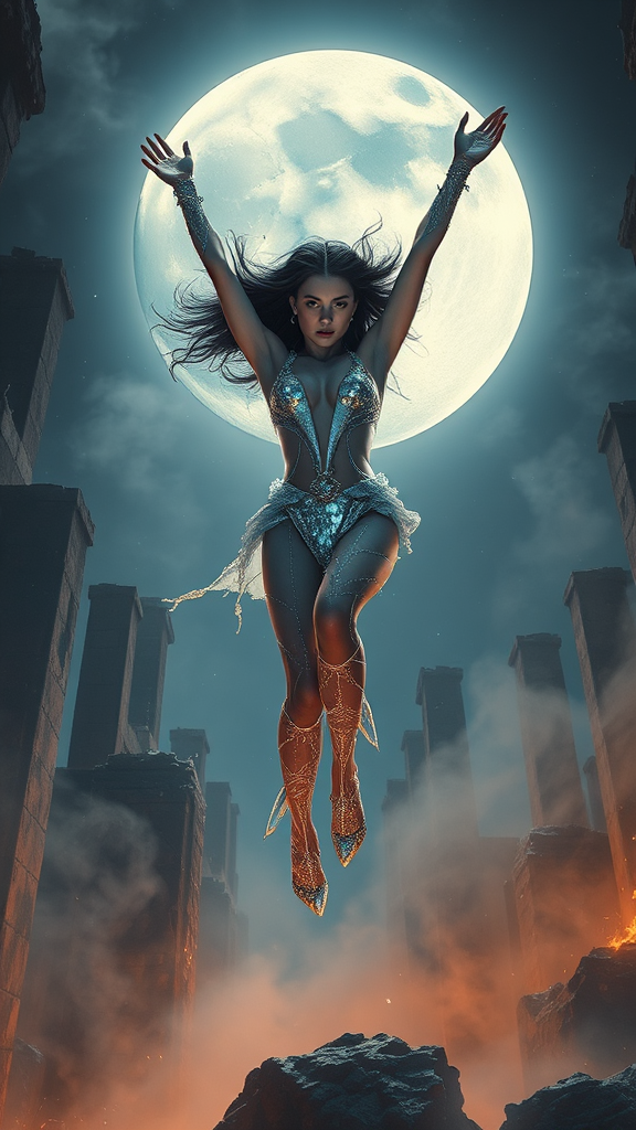 A mesmerizing scene unfolds as a girl in a provocative outfit crafted from the finest crystalline threads takes center stage. Her diamond-like skin shimmers and sparkles under the ethereal glow of a massive moon, casting a divine aura around her. With superhuman grace, she soars through the mystical, unearthly ruins, embodying the ritual ascent of a deity. The scene is rendered in hyper-realistic, hyper-detailed 4D dimensions, set against a backdrop of swirling ultramarine fog that encapsulates the dark aesthetic. She strikes a daring, dynamic pose, her full body captured in an alluring position that exudes scandalous elegance. This dark fantasy is envisioned through the creative lens of Antonio J. Manzanedo, with influences of unreal engine visuals and a 3D octane ranger style, all set within a galaxy of resplendent beauty.