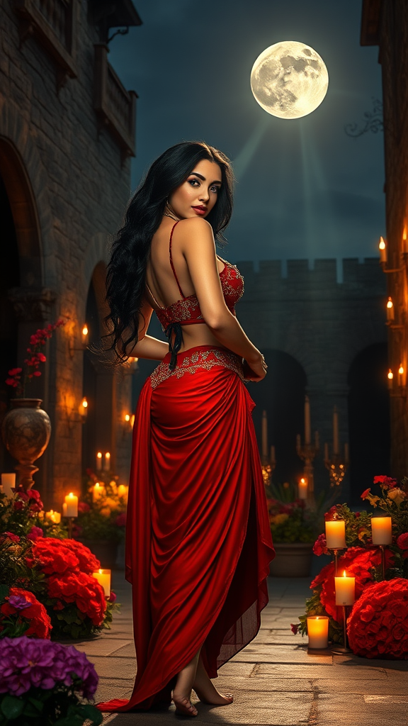 A mesmerizing scene unfolds as moonlight streams down, mingling with the flicker of torchlight and candles, enveloping a stunning figure dressed in a dazzling red and gold belly dance ensemble. Amidst the timeless grandeur of a medieval castle courtyard at dusk, the full moon's glow highlights her graceful form, capturing her in a moment of enchanting allure. Barefoot and amidst a riot of colorful blooms, her gaze ensnares all who dare look. An elegant black choker graces her neck, exuding mystery. Cascading raven waves reach her hips, their sheen accentuated by soft, diffused light. With her back to the camera, she glances over her shoulder, beckoning intrigue. Taken with a Leica M10 paired with the classic Helios-44 58mm f/2 lens, this fine art color photograph reveals deep, rich hues and exquisite highlights. The midday sun enhances her luminous visage, while its gentle rays pierce through her cascading hair, sculpting the contours of her silhouette.