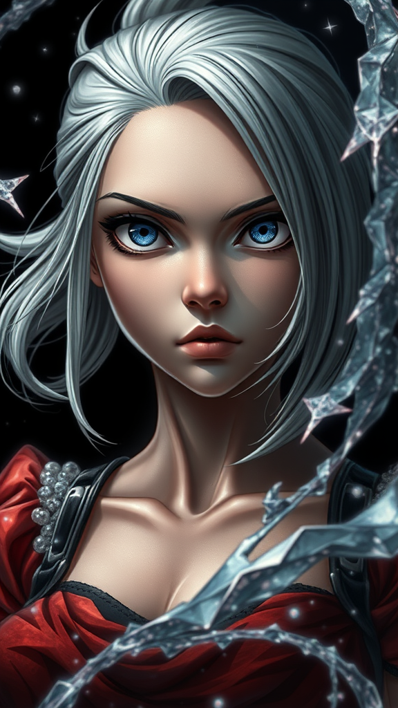 A mesmerizing scene unfolds on a black background, where One Punch Man's Tornado gazes intently at the viewer. Her figure is rendered in hyper-realistic detail, merging the captivating allure of transfixing marine scenes with the whimsical elements of dolly kei and the mythical essence of dragoncore. Her expression is imbued with an expressive intensity, drawing you into a world of imaginative wonder. Realistic textures define her features, accentuated by a close-up perspective that highlights the intricate detailing of her attire and ethereal presence. The image captures a balance of realism and fantasy, offering a unique interpretation of a beloved character.