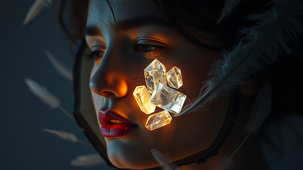 A mesmerizing scene unfolds with a wooden slice embedded with radiant glowing crystals, casting an ethereal light over a person's face, captured in the style of surreal fashion photography. Delicate fine feather details intertwine with organic, nature-inspired forms. Strong contrasts between light and shadow give the image depth, evoking the transient beauty of ephemeral installations. The detailed depictions of nature add to the surreal atmosphere, blending the mystical with the tangible, inviting viewers into a captivating world of dreamlike elegance and intricate artistry.