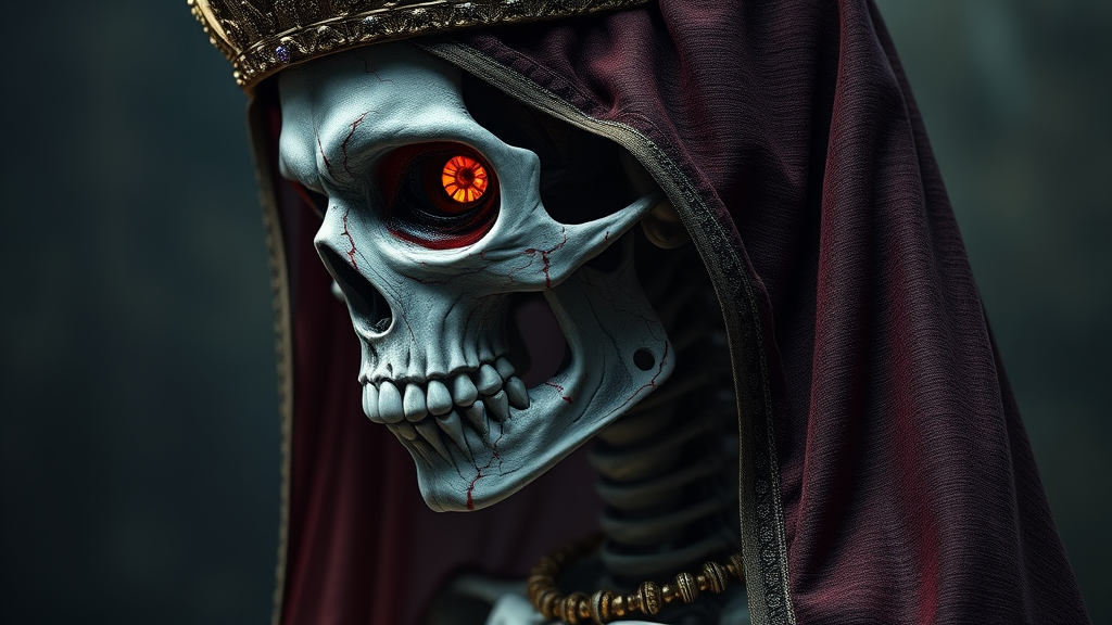 A mesmerizing skeletal woman, draped in the regal attire of a queen reigning over the underworld, her eye area vividly colored, yet hollow, accentuated by veins and traces of blood. Her intricate and detailed appearance captivates, embodying the essence of the living dead, both morbid and unholy. Presented in a sideways pose, she stands as a fantasy embodiment of the undead. The imagery is extremely intricate, cinematic, hyper-realistic, and highly detailed, rendered in stunning 4k and 8k UHD, with HDR effects. The scene exudes a sense of unreal beauty, maintaining coherence and anatomical correctness, free of any deformations or anomalies, all within the realm of a darkly enchanting fantasy brought to life.