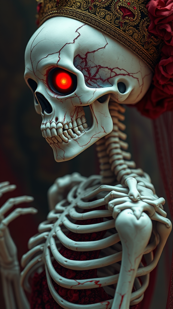 A mesmerizing skeleton woman adorned in regal attire, the queen of the underworld, with vividly colored eye areas contrasting her hollow eyes. Her form is ethereal and haunting, with visible blood and veins creating an intricate network across her morbid, unholy visage. Posed in a captivating sideways stance, she embodies the living dead within a fantasy realm. The depiction is hyper-realistic, extremely intricate, and cinematic, showcasing detailed textures and layers in absurdres 4k, 8k, UHD, and HDR quality. The scene is rendered with exceptional clarity, capturing a haunting yet majestic aura while avoiding any unreal or disturbing distortions, ensuring a flawless representation of this fantastical queen.